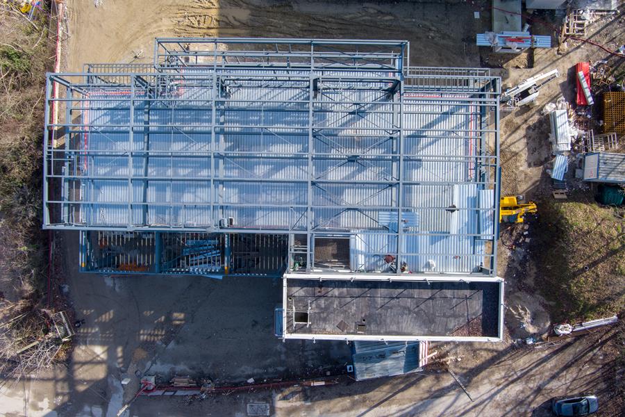 Un des bâtiments qui compose la future résidence Horizon Voltaire présente un procédé technique assez exceptionnel pour un programme résidentiel. En effet, afin de ne pas impacter le bâtiment de télécommunication Orange existant sur site, Sogerim a prévu d'adapter structurellement un édifice englobant ce dernier en ramenant des étages au- dessus. Il a donc été opté pour le passage via une ossature métallique d'envergure, venant se fonder de part et d'autre du bâtiment de télécommunication existant, formant une arche pour qu'aucun appui ne se fasse sur la toiture de ce dernier. Il a été nécessaire de mettre en oeuvre des sections de pannes permettant de soutenir les étages supérieurs sur les 12 mètres de largeur à porter. S'inscrivant sur environ 33 mètres de long, cette charpente métallique constitue l'élément principal du squelette structurel du nouveau bâtiment. Un remplissage en dalle de béton vient par la suite former un plancher collaborant qui permettra l'insertion des logements sur les parties courantes.